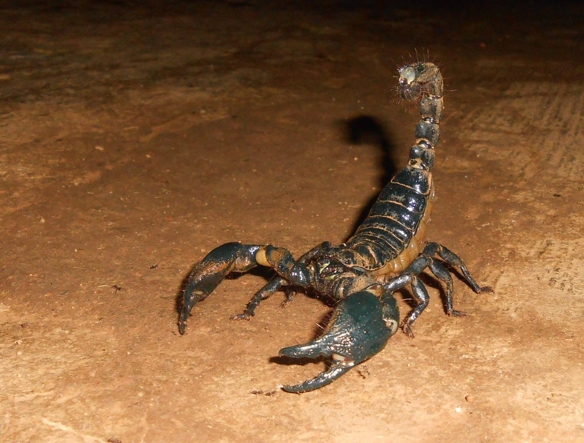 The Giant Rainforest Scorpion (Gigantometrus swammerdami) is the largest species of scorpion, coming in at 9 inches long. Like most new world scorpions, they don't have very potent venom becasue they have adapted to crushing their prey with their pincers instead. They can range in color from reddish-brown to a deep reddish-black. This helps them blend into their favorite hiding spots in the forests in India, under big leaf litter piles.